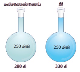 ஒரு குடுவையில் 250 செமீ3 அளவு நீரையும் மற்றொன்றில் அதே அளவு மண்ணெண்ணையையும் நிரப்பவும்.