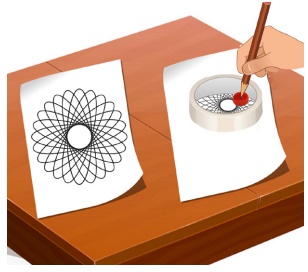 ஒரு காகிதத்தை எடுத்துக் கொண்டு, அதில் செலோடேப்பை வைக்கவும். பாட்டில் மூடியில் 2 (அ) மூன்று துளைகள் போடவும். பாட்டில் மூடியை செலோடேப்பினுள் வைக்கவும். அதில் கரிக்கோலை சொருகவும். செலோடேப்பை அழுத்தமாக பிடிக்கவும்.செலோடேப்பினுள் கரிக்கோலை இங்குமங்குமாக இழுத்துஸ்பைரோகிராப் வரையவும். நமக்கு ஸ்பைரோகிராப் கிடைக்கப் பெற்றது.