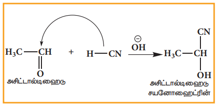 எடுத்துக்காட்டு: அசிட்டால்டிஹைடுடன் HCN புரியும் சேர்க்கை வினை