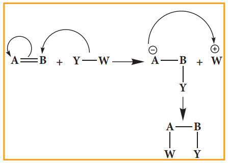 ஒரு பொதுவான எலக்ட்ரான்கவர் பொருள் சேர்க்கை வினையினை பின்வருமாறு குறிப்பிடலாம்.
