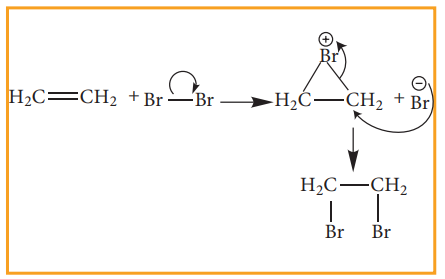 ஆல்கீன்கள் புரோமினேற்றம் அடைந்து புரோமோ ஆல்கேன்களைத் தரும் வினை இவ்வகை வினைக்கான ஒரு எடுத்துக்காட்டாகும்.