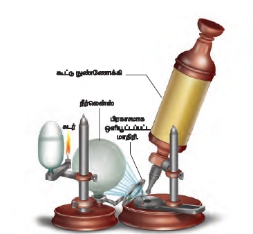 வைக்கப்பட்டுள்ள பொருளிற்கு ஒளியூட்டினார். அதன் மூலம் அப்பொருளின் நுண்ணிய பகுதிகளை நுண்ணோக்கியின் மூலம்