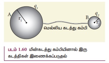 A, B என்ற இரு மின்கடத்து கோளங்கள் ஒரு மெல்லிய கடத்து கம்பியினால் ஒன்றோடொன்று இணைக்கப்பட்டுள்ளன.