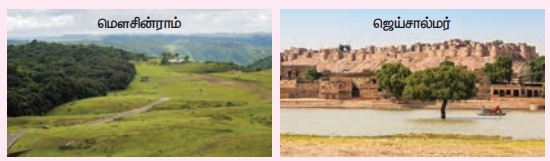 மேகாலயாவில் உள்ள மௌசின்ராம் அதிக மழை பொழியும் பகுதி ஆகும். ராஜஸ்தானில் உள்ள ஜெய்சால்மர் குறைவான மழைப்பொழியும் பகுதி ஆகும்.