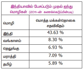 இந்தியா 122 முக்கிய மொழிகளையும், 1599 பிற மொழிகளையும் கொண்டுள்ளது. இந்தோ- ஆரியன்,