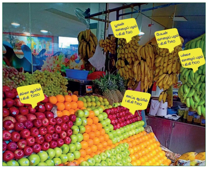 1 கி.கி சிம்லா ஆப்பிள் + 1 கி.கி பூவன் வாழைப்பழம் + 1 கி.கி பேயன் வாழைப்பழம் = ₹250 + ₹90 + ₹140 = ₹480