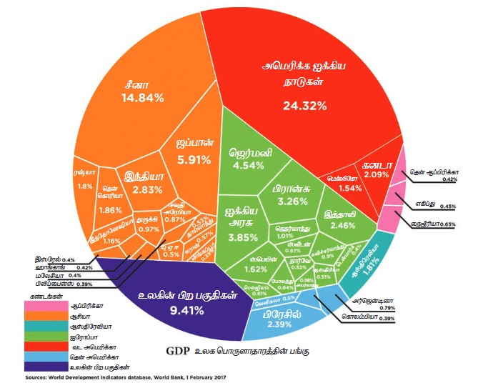 கீழே கொடுக்கப்பட்டுள்ள விளக்கப்படத்தில் 40 பெரிய பொருளாதார நாடுகளை தனித்தனியாக சுட்டிக் காட்டப்பட்டுள்ளது. ஆனால் அவை கண்டங்கள் வாரியாக குழுவாக வண்ணமிடப்பட்டுள்ளது. இதில் ஆசியகுழுமம் அனைத்தையும்விட பெரிதாக உள்ளது. அது உலக மொத்த உற்பத்தியில் மூன்று பங்காக (33.84%) உள்ளது. வட அமெரிக்க கண்டம் மொத்த உற்பத்தியில் கால்பாகத்தை (27.95%) கொண்டுள்ளது. ஐரோப்பா கண்டம் ஐந்தில் ஒரு பாகத்தை (21.37%) பெற்றுள்ளது. இந்த மூன்று குழுமங்களும் உலகின் மொத்த உற்பத்தியில் ஐந்தில் நான்கு (4/5) பாகத்தை இயக்கும் தன்மை (83.16%) கொண்டுள்ளன.