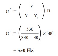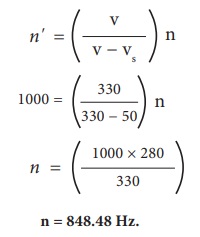 உடைய ஒலி மூலமானது, 30 மீவி-1 வேகத்தில் கேட்குநரை நோக்கி நகர்கிறது. காற்றில் ஒலியின் வேகம் 330 மீவி-1 எனில் கேட்குநரால் உணரப்படும்