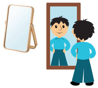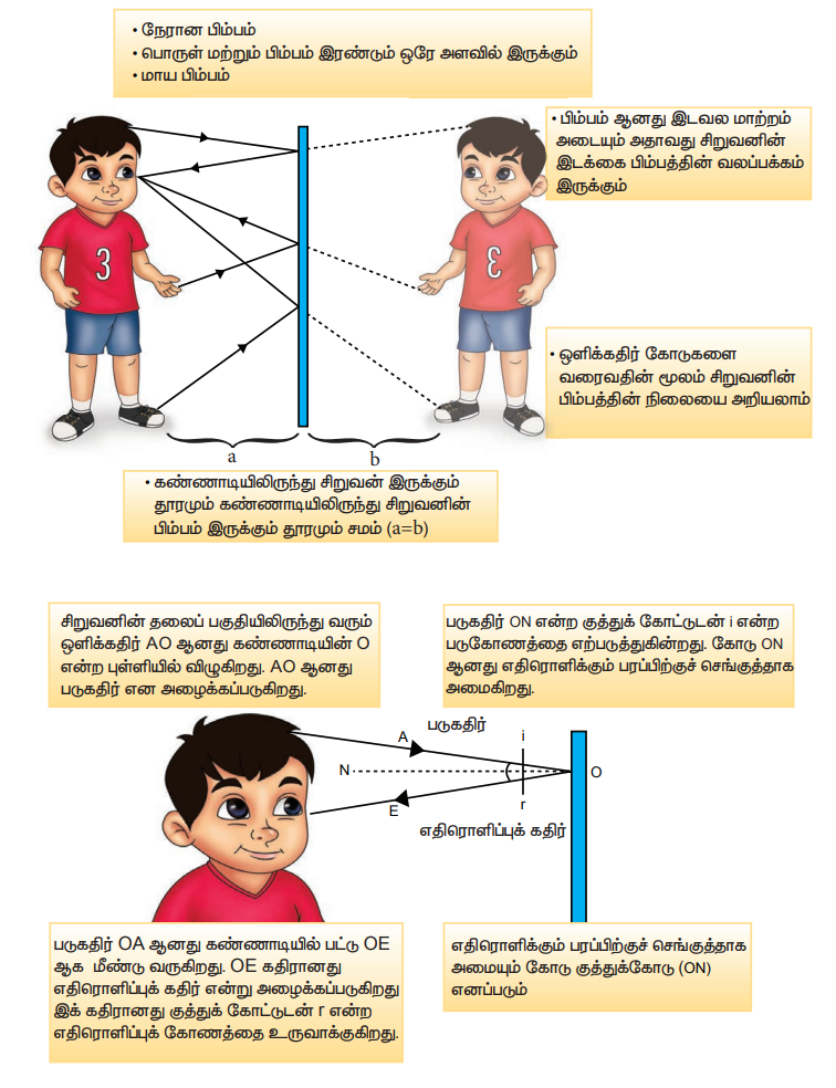 • கண்ணாடியிலிருந்து சிறுவன் இருக்கும் தூரமும் கண்ணாடியிலிருந்து சிறுவனின் பிம்பம் இருக்கும் தூரமும் சமம் (a=b)
