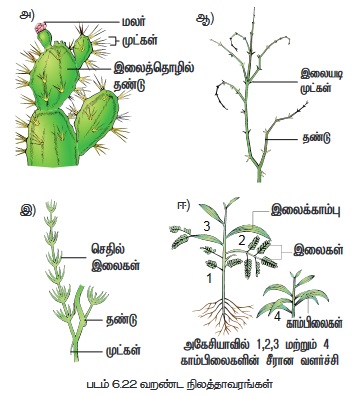 • முழு இலைகளும் முட்களாகவோ (ஒபன்ஷியா),மற்றும் செதில்களாகவோ (ஆஸ்பராகஸ்) மாற்றுரு அடைந்து காணப்படுகிறன.