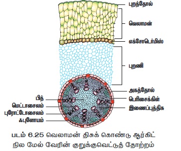 • பல்லடுக்கு புறத்தோல் காணப்படுகிறது. வெலாமன் திசுவினை அடுத்துச் சிறப்பாக அமைந்த எக்சோடெர்மிஸ் (Exodermis) அடுக்கு ஒன்று காணப்படுகிறது.