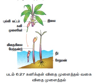 • கனிக்குள் விதை முளைத்தல் (Vivipary)வகையான விதை முளைத்தல் அதாவது கனியில் உள்ள போதே விதைகள் முளைப்பது உவர் சதுப்பு நிலத் தாவரங்களில் காணப்படுகிறது.