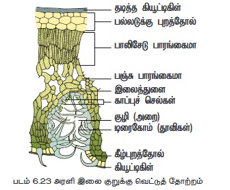 • நீராவிப் போக்கின் காரணமாக நீர் இழப்பினைத் தடுப்பதற்காகப் பல்லடுக்கு புறுத்தோலுடன் தடித்த கியூட்டிகளும் காணப்படுகின்றன.