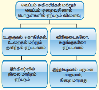 திண்மம், திரவம் மற்றும் வாயுக்களை வெப்பப்படுத்தும்பொழுது சுருங்குதல். விரிதலையும் கடந்து வேறு சில சாத்தியக்கூறுகள் உண்டு. உருகுதல், கொதித்தல், உறைதல் மற்றும் குளிர்வித்தல் போன்ற செயல்களால் பொருளின் இயற்பியல் நிலையில் மாற்றம் ஏற்படும். அவற்றைப் பற்றி விரிவாக பார்க்கலாம்.