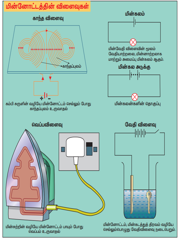 மேலும், மின்னோட்டத்தினால் பல்வேறு விளைவுகள் ஏற்படுகின்றன. இப்பாடப்பகுதியில் அவற்றின் சில விளைவுகளைக் காண்போம்.