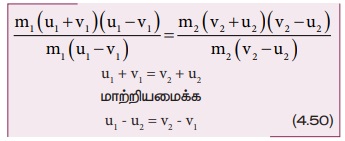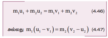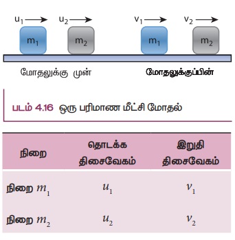 m1 மற்றும் m2 நிறையுள்ள இரு மீட்சிப் பொருள்கள் படம் 4.16 இல் காட்டியுள்ளவாறு ஒரு உராய்வற்ற கிடைத்தளப்பரப்பில் நேர்க்கோட்டில் (நேர் x - அச்சின் திசையில்) இயங்குவதாகக் கருதுக.
