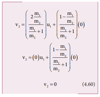 சமன்பாடு (457) மற்றும் (4.58) தெரிவிப்பது என்னவெனில் முதல் பொருள் மோதலுக்குப் பின் ஓய்வு நிலைக்கு வரும்போது இரண்டாவது பொருள் முதல் பொருளின் தொடக்க திசை வேகத்தில் இயங்குகிறது.