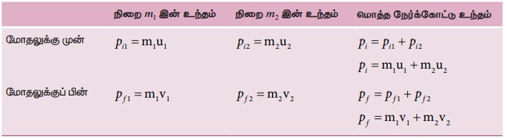 நேர்க்கோட்டு உந்த மாறா விதியில் இருந்து மோதலுக்கு முன் மொத்த உந்தம் (Pi) = மோதலுக்குப் பின் மொத்த உந்தம் (Pf)