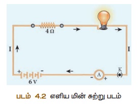 சாவி ஆகியவைகளைக் கொண்டு உருவாக்கப்பட்ட ஒரு எளிய மின்சுற்று படம் 4.3 ல் காட்டப்பட்டுள்ளது.
