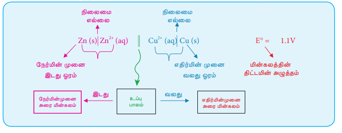 மின்கல குறியீட்டை பயன்படுத்தி மின்கலத்தை விளக்குக, மேலும் அரை வினைகளை எழுதுக.