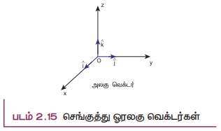 (3) செங்குத்து ஓரலகு வெக்டர்கள்: மூன்று ஓரலகு வெக்டர்கள் iˆ, jˆ மற்றும் kˆ ஆகியவற்றைக் கருதுக. இந்த மூன்று ஓரலகு வெக்டர்களும் x, y மற்றும் z அச்சின் நேர்குறி திசையினைக் காட்டுகின்றன. இவற்றில், எந்த இரண்டு ஓரலகு வெக்டர்களுக்கு இடையே உள்ள கோணம் 90° ஆகும். இவ்வாறு ஒன்றுக்கொன்று செங்குத்தாகச் செயல்படும் ஓரலகு வெக்டர்களுக்கு செங்குத்து ஓரலகு வெக்டர்கள் என்றும் பெயர். இங்கு iˆ, jˆ மற்றும் kˆ என்பவை செங்குத்து ஓரலகு வெக்டர்களைக் குறிக்கிறது. இது படம் 2.15ல் காட்டப்பட்டுள்ளது.