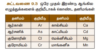 தனிமங்களுள் ஒரு தனிமத்திற்கு முதல் இரண்டு எழுத்துக்களும், மற்றொரு தனிமத்திற்க முதல்