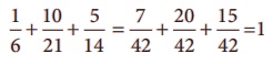 இந்த எடுத்துக்காட்டில் நிகழ்தகவுகளின் மொத்தக் கூடுதல் 1ஐ விட அதிகமாகவில்லை என்பதைக் கவனிக்கவும் (1/6) + (10/21) + (5/14) = (7/42) + (20/42) + (15/42) = 1