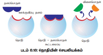 நொதியால் ஊக்குவிக்கப்படும் வினையின் ஆரம்பப்பொருள் தளப்பொருள் எனப்படும். அது மாற்றமடைந்து விளைப்பொருள் ஆகிறது. தளப்பொருளானது பதப் நொதியின் மீது உள்ள ஊக்குவிப்பு தளம் என்ற பகுதியோடு பிணைத்துக் கொள்கிறது. இது பூட்டு - சாவி இயக்க முறையில் நிகழும் நொதி செயலாகும். (Lock and key mechanism) இவ்வாறு நொதி- தளப்பொருள் கூட்டுத்தொகுதி உருவாகும் போது தளப்பொருளின் ஆற்றல் உயர்ந்து இடைநிலையை அடைந்து பின்னர் விளைப்பொருட்களாக மாறுவதுடன் நொதி எந்த மாற்றமும் அடையாமல் விடுவிக்கப்படுகிறது (படம் 8.18).