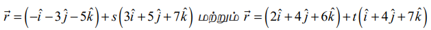 ஆகிய கோடுகள் ஒரே தளத்தில் அமையும் எனக்காட்டுக. மேலும், இக்கோடுகளைத் தன்னகத்தே கொண்டுள்ள தளத்தின் துணையலகு அல்லாத வெக்டர் சமன்பாட்டைக் காண்க.