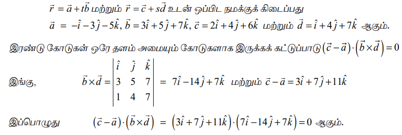 எனவே, கொடுக்கப்பட்ட இரண்டு கோடுகளும் ஒரே தளத்தில் அமையும். இப்பொழுது, இவ்விரு கோடுகளும் அமையும் தளத்தின் துணையலகு அல்லாத வெக்டர் சமன்பாட்டைக் காண்போம். ஒரே தளத்தில் அமையும் இரண்டு கோடுகளைக் கொண்ட தளத்தின் வெக்டர் சமன்பாடு