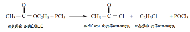 எஸ்டர்கள், PCI3 உடன் வினைப்பட்டு அசைல் மற்றும் ஆல்கைல் குளோரைடுகளின் கலவையை தருகின்றன.