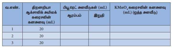 KMnO4 இணைப்புக் கரைசலின் கனஅளவு (V1) = -----------mL