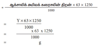 1250 mL கரைசலில் கரைந்துள்ள படிக ஆக்சாலிக் அமிலத்தின் நிறை = ஆக்சாலிக் அமிலக் கரைசலின் திறன் × 63 × 1250 / 1000 = கிராம்