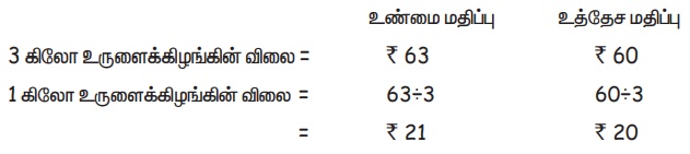 3 கிலோ உருளைக்கிழங்கின் விலை ₹ 63 எனில், அதன் விலையை அருகிலுள்ள பத்திற்கு முழமைப்படுத்துக. பிறகு, 1 கிலோ உருளைக்கிழங்கின் உத்தேச விலையைக் காண்க.