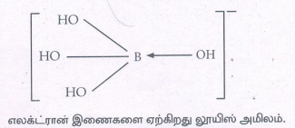 4. கீழே குறிப்பிடப்பட்டுள்ளவாறு H3BO3 மூலக் கூறானது நீரிடமிருந்து ஹைட்ராக்சைடு அயனியை ஏற்றுக்கொள்கிறது. H3BO3(aq) + H2O(l) ⇌ B(OH)4- + H+ லூயி கொள்கையை பயன்படுத்தி H3BO3 மூலக்கூறின் தன்மையை கண்டறிக.