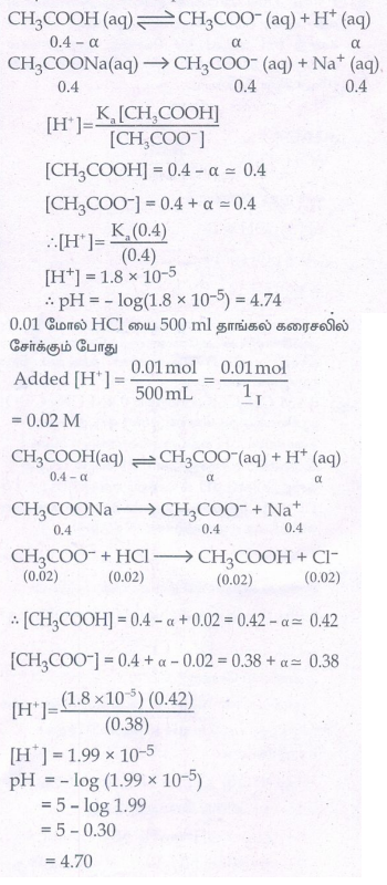 ஆ) 0.4MCH3COOH மற்றும் 0.4M CH3 COONa ஆகியவற்றைக் கொண்டுள்ள ஒரு தாங்கல் கரைசலின் pH மதிப்பை கணக்கிடுக 500ml மேற்கண்ட கரைசலுடன் 0.01 மோல் HCl ஐ சேர்த்த பின்பு pH ல் மாற்றம் என்ன? (Ka = 1.8 × 10-5) HCI ஐ சேர்ப்பதினால் ஏற்படும் கன அளவு மாற்றத்தை ஒதுக்கத்தக்கதாக கருதுக.