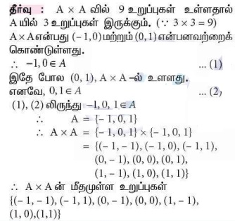 2. A×A கார்டீசியன் பெருக்கல் பலனின், 9 உறுப்புகளில், உறுப்புகள் (-1, 0) மற்றும் (0, 1) – யும் இருக்கிறது எனில், A -யில் உள்ள உறுப்புகளைக் காண்க. மற்றும் A×A -ன் மீதமுள்ள உறுப்புகளைக் காண்க.