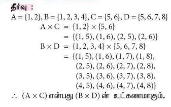 7. A = {1,2}, B = {1,2,3,4}, C = {5,6} மற்றும் D = {5,6,7,8} எனில், A×C ஆனது B×D உட்கணமா எனச் சரிபார்க்க.