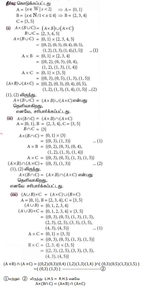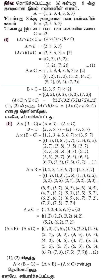 4. A = {5, 6}, B = {4, 5, 6}, C = {5, 6, 7} எனில், A × A = (B × B) ∩ (C ×C) எனக் காட்டுக.