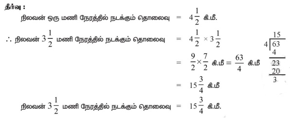 9. நிலவன் ஒரு மணி நேரத்தில் 4 ½ கி.மீ நடக்க முடியுமென்றால் அவர் 3½ மணி நேரத்தில் எவ்வளவு தூரத்தைக் கடப்பார்?