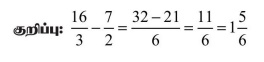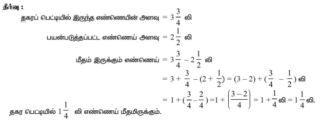 8. ஒரு தகரப் எண்ணெய் பெட்டியில் 3 ¾ லிட்டர் எண்ணெய் இருந்தது. அதிலிருந்து 2 ½ லிட்டர் எண்ணெய் பயன்படுத்தப்பட்டுவிட்டது எனில், எவ்வளவு எண்ணெய் மீதம் இருக்கும்?