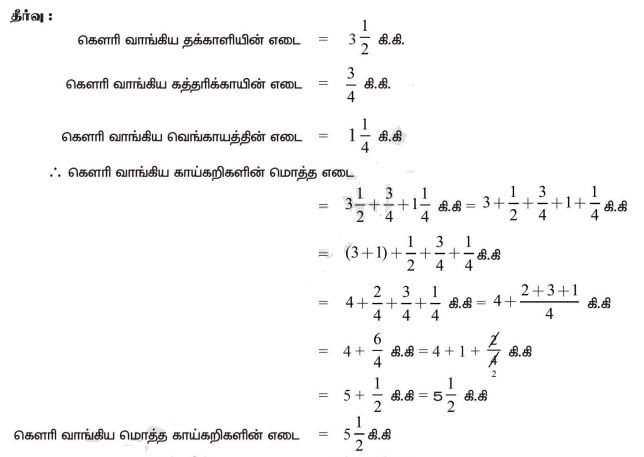 7. கௌரி 3½ கி.கி தக்காளியையும் 3/4 கி.கி கத்தரிக்காயையும் 1 ¼ கி.கி வெங்காயத்தையும் வாங்கினார். அவர் வாங்கிய காய்கறிகளின் மொத்த எடை எவ்வளவு?