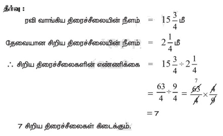10. 15¾ மீ நீளமுள்ள திரைச்சீலையை (curtain) ரவி வாங்கினார். அவர் அதை ஒவ்வொன்றும் 2¼ மீ நீளமுள்ள சிறிய திரைச்சீலைகளாக வெட்டினால் அவருக்கு எத்தனைச் சிறிய திரைச்சீலைகள் கிடைக்கும்?