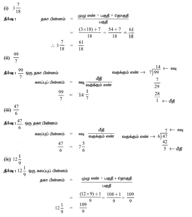 4. கலப்புப் பின்னத்தைத் தகா பின்னமாக மாற்றுக மற்றும் அவற்றின் நேர்மாறு காண்க.
