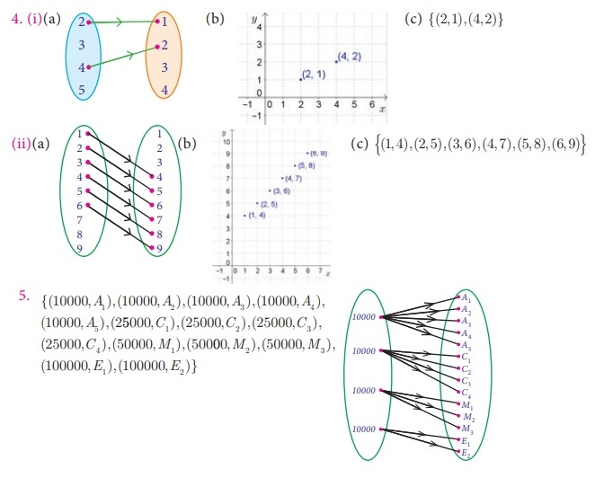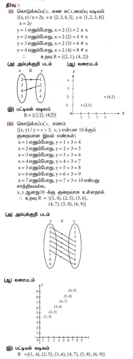 4. கொடுக்கப்பட்ட உறவுகள் ஒவ்வொன்றையும் (1) அம்புக்குறி படம் (2) வரைபடம் (3) பட்டியல் முறையில் குறிக்க.