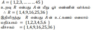 2. A = {1,2,3,4,...,45} மற்றும் R என்ற உறவு "A -யின் மீது, ஓர் எண்ணின் வர்க்கம்" என வரையறுக்கப்பட்டால், R-ஐ A ×A - யின் உட்கணமாக எழுதுக. மேலும் R-க்கான மதிப்பகத்தையும், வீச்சகத்தையும் காண்க.