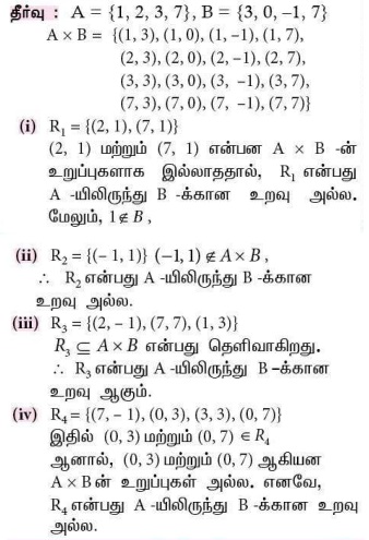 1. A = {1,2,3,7} மற்றும் B = {3, 0, –1,7}, எனில், பின்வருவனவற்றில் எவை A -லிருந்து B -க்கான உறவுகளாகும்?