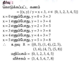3. R என்ற ஒரு உறவு {(x , y) / y = x + 3, x ∈ {0, 1, 2, 3, 4, 5}}. எனக் கொடுக்கப்பட்டுள்ளது. இதன் மதிப்பகத்தையும் வீச்சகத்தையும் கண்டறிக.
