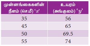 10. அருகில் உள்ள அட்டவணையில் நான்கு நபர்களின் முன்னங்கைகளின் நீளம் மற்றும் அவர்களுடைய உயரங்களின் தகவல்கள் வழங்கப்பட்டுள்ளன. அந்த விவரங்களின் அடிப்படையில் ஒரு மாணவர், உயரம் (y) மற்றும் முன்னங்கை நீளம் (x)- க்கான உறவை y = ax + b எனக் கண்டுபிடித்தார். இங்கு a மற்றும் b ஆகியவை மாறிலிகள்.
