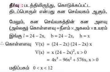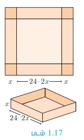 7. 24 செ.மீ பக்க அளவுள்ள சதுர வடிவத் துண்டிலிருந்து நான்கு மூலைகளிலும் சம அளவுள்ள சதுரங்களை வெட்டி படம் 1.17-ல் உள்ளவாறு மேல்புறம் திறந்த ஒரு பெட்டி செய்யப்படுகிறது. இந்தப் பெட்டியின் கன அளவு V எனில், V ஐ x-யின் சார்பாகக் குறிப்பிடுக.